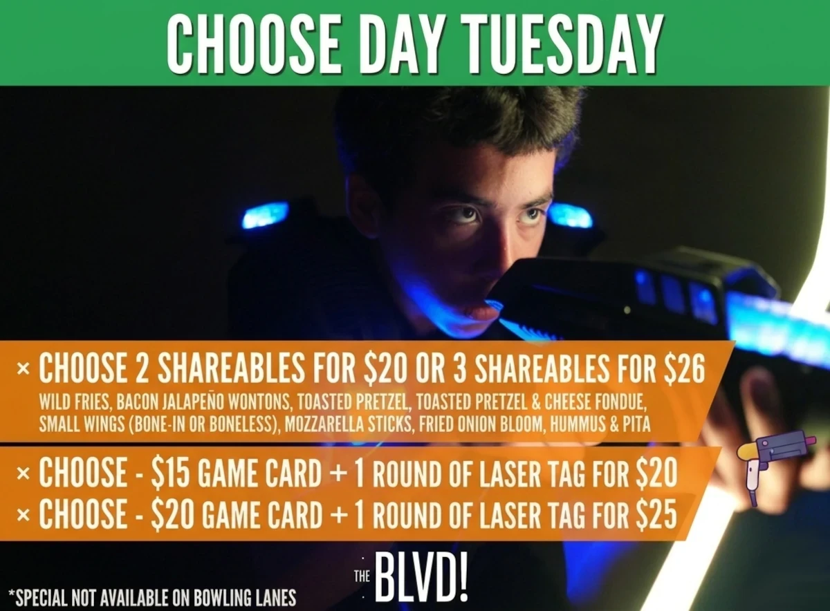CHOOSE DAY TUESDAY Choose 2 Shareables for $20 or 3 for $26: Wild Fries, Bacon Jalapeño Wontons, Toasted Pretzel & Cheese Fondue, Small Wings, Mozzarella Sticks, Fried Onion Bloom, Hummus […]