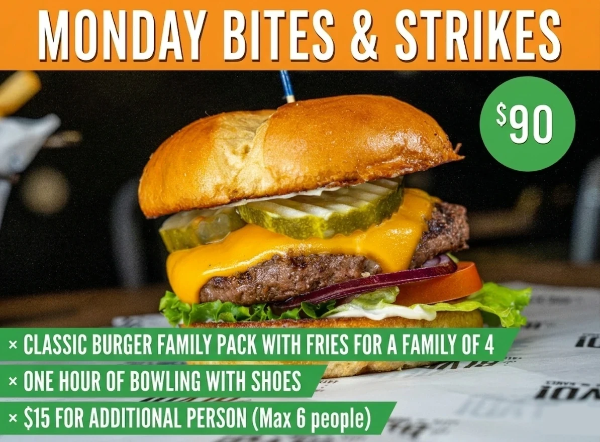MONDAY BITES & STRIKES $90 Package Includes: - Classic Burger Family Pack with fries for a family of 4 - One hour of bowling with shoes - $15 for each […]